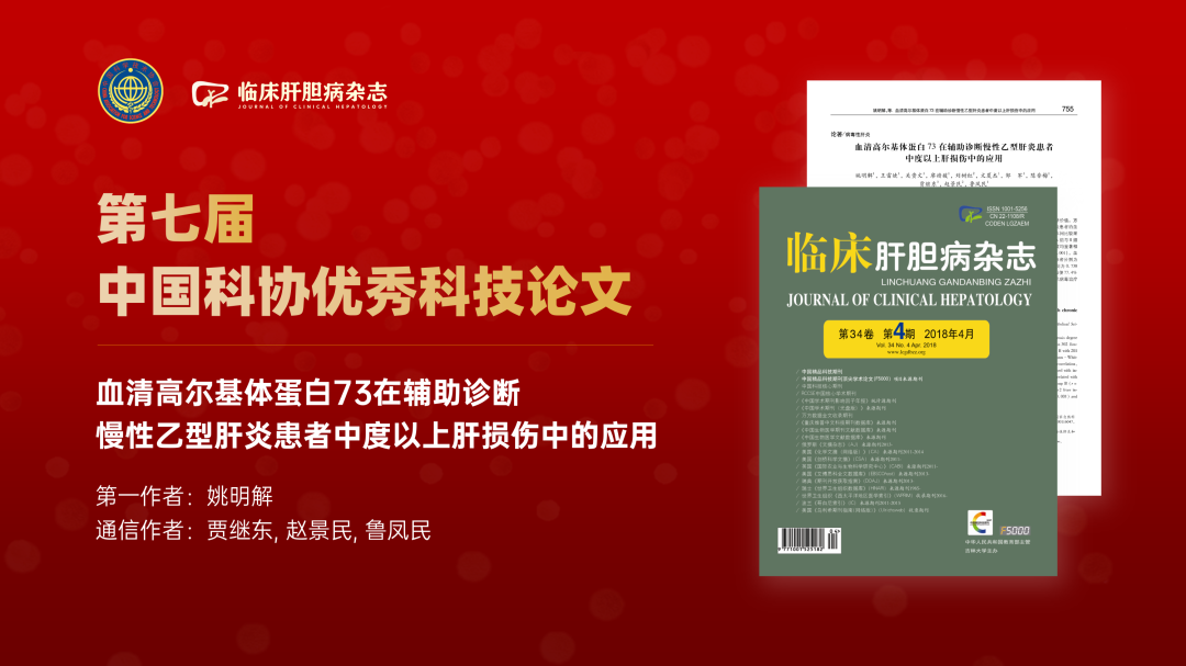 《临床肝胆病杂志》2018年第4期文章《血清高尔基体蛋白73在辅助诊断慢性乙型肝炎患者中度以上肝损伤中的应用》(第一作者:姚明解;通信作者:鲁凤民、贾继东、赵景民)获此殊荣!