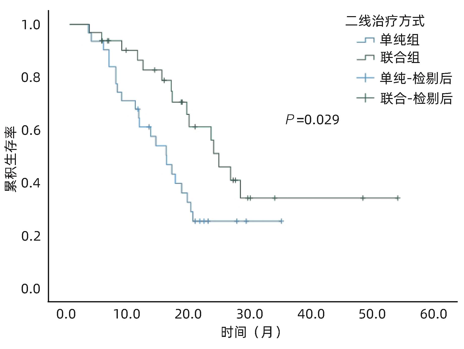 目的 评估酪氨酸激酶抑制剂(TKI)联合免疫检查点抑制剂在中晚期肝细胞癌(HCC)二线治疗中的效果及安全性。 方法 收集2018年1月—2022年12月苏州大学附属第一医院介入科收治的经过经肝动脉化疗栓塞术(TACE)联合一线TKI治疗后进展/不耐受,换用二线TKI联合或者不联合免疫检查点抑制剂的63例中晚期HCC患者的临床资料。其中使用二线TKI联合免疫检查点抑制剂共32例(联合组),使用二线TKI共31例(单纯组)。依据改良实体瘤疗效评价标准(mRECIST)评估肿瘤反应,根据通用不良事件术语5.0标准(CTCAE 5.0)评估不良事件。使用Kaplan-Meier法计算两组的中位生存期(mOS)、中位无进展生存期(mPFS)。比较两组的客观缓解率(ORR)和疾病控制率(DCR)。基线资料及随访结果的组间比较采用χ2检验。 结果 63例患者中位随访时间为16.5(3.2~53.4)个月。联合组mOS、mPFS 分别为24.3个月(95%CI:20.0~28.6)和9.8个月(95%CI:7.5~12.1),15.8个月(95%CI:11.4~20.1)和4.1个月(95%CI:3.2~4.9),两组mOS、mPFS之间差异均有统计学意义(P值分别为0.029、0.038)。联合组ORR和DCR分别为47%和84%,单纯组为19%和65%,两组之间ORR差异有统计学意义(P=0.021),DCR差异无统计学意义(P=0.070)。联合组中4例(12.5%)、单纯组中3例(10.0%)发生Ⅲ~Ⅳ级严重不良事件,两组均无药物不良反应致死事件,两组患者不良事件的发生率比较,差异无统计学意义(P=0.783)。 结论 与单用TKI治疗相比,TKI联合免疫检查点抑制剂作为中晚期HCC二线治疗的疗效更显著,且不会增加严重不良反应。 Abstract:Objective To investigate the efficacy and safety of tyrosine kinase inhibitor (TKI) combined with immune checkpoint inhibitor as the second-line therapy for advanced hepatocellular carcinoma (HCC). Methods A retrospective analysis was performed for the clinical data of 63 patients with advanced HCC who were admitted to Department of Interventional Radiology, The First Affiliated Hospital of Soochow University, from January 2018 to December 2022, and all patients experienced progression/intolerance after transcatheter arterial chemoembolization combined with first-line TKI and were switched to second-line TKI with or without immune checkpoint inhibitor. The 32 patients receiving second-line TKI with immune checkpoint inhibitor were enrolled as combination group, and the 31 patients receiving second-line TKI alone were enrolled as single treatment group. Modified Response Evaluation Criteria in Solid Tumors was used to evaluate tumor response, and Common Terminology Criteria for Adverse Events 5.0 was used to evaluate adverse events. The Kaplan-Meier method was used to calculate median overall survival (mOS) and median progression-free survival (mPFS) for the two groups, and the two groups were compared in terms of objective response rate (ORR) and disease control rate (DCR). The chi-square test was used for comparison of baseline data and follow-up results between groups. Results The median follow-up time was 16.5 (3.2 — 53.4) months for the 63 patients. The combination group had an mOS of 24.3 (95% confidence interval [CI]: 20.0 — 28.6) months and an mPFS of 9.8 (95%CI: 7.5 — 12.1) months, while the single treatment group had an mOS of 15.8 (95%CI: 11.4 — 20.1) months and an mPFS of 4.1 (95%CI: 3.2 — 4.9) months, and there were significant differences in mOS and mPFS between the two groups (P=0.029 and 0.038). The combination group had an ORR of 47% and a DCR of 84%, while the single treatment group had an ORR of 19% and a DCR of 65%; there was a significant difference in ORR between the two groups (P=0.021), but with no significant difference in DCR between the two groups (P=0.070). As for adverse events, 4 patients (12.5%) in the combination group and 3 (10.0%) in the single treatment group experienced grade Ⅲ — Ⅳ serious adverse events, with no fatal drug reactions in either group, and there was no significant difference in the incidence rate of adverse events between the two groups (P=0.783). Conclusion Compared with TKI alone, TKI combined with immune checkpoint inhibitor has a more significant therapeutic effect as the second-line therapy for advanced HCC, without increasing serious adverse reactions. -