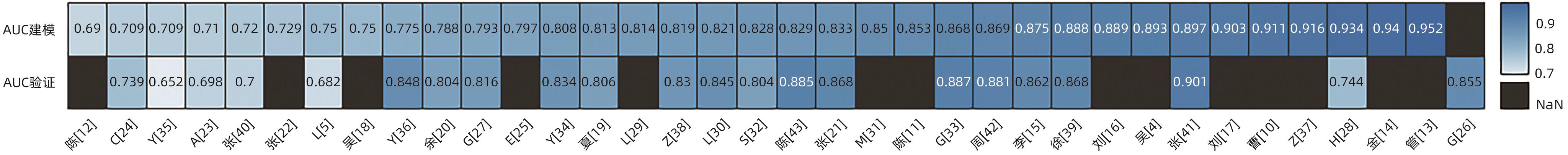 校准方法 验证方法 吴浩然[4] 单因素分析 1 Logistic回归 2.605 未提及 0.893 Hosmer-Lemeshow 未提及 Lee[5] 单因素分析 4 Logistic回归 210.559 未提及 0.750/0.682 Calibration校正曲线 内部验证 曹昕彤[10] 单因素分析 1 Logistic回归 8.757 未提及 0.911 未提及 未提及 陈富华[11] 单因素分析 1 Logistic回归、列线图 6.800 已排除 0.853 Calibration校正曲线 内部验证 陈龙江[12] 单因素分析、LASSO回归 3 Logistic回归 17.967 未提及 0.69 未提及 未提及 管清春[13] 单因素分析 1 Logistic回归 3.000 未提及 0.952 未提及 未提及 金继宽[14] 单因素分析 1 Logistic回归 7.750 已排除 0.94 未提及 未提及 李轲[15] 单因素分析 1 Logistic回归、列线图 8.436 已排除 0.875/0.862 Hosmer-Lemeshow 内部验证 刘少东[16] 单因素分析 1 Logistic回归 8.648 已排除 0.889 未提及 未提及 刘香玉[17] 单因素分析 1 Logistic回归 22.932 已排除 0.903 Hosmer-Lemeshow 内部验证 吴耐[18] 单因素分析 1 Logistic回归 9.338 未提及 0.75 未提及 未提及 夏武政[19] 单因素分析 1 logistic回归 10.013 未提及 0.813/0.806 内部验证 余俊[20] 单因素分析 1 Logistic回归 20.324 已排除 0.788/0.804 Calibration校正曲线 内部验证 张冲[21] 单因素分析 1 Logistic回归 31.680 未提及 0.833/0.868 未提及 内部验证 张佳帏[22] 单因素分析 1 Logistic回归、列线图 18.669 已排除 0.729 Calibration校正曲线、决策曲线 内部验证 Akgul[23] 单因素分析 1 Logistic回归 8.250 未提及 0.710/0.698 Calibration校正曲线 外部验证 Choi[24] 单因素分析 1 Logistic回归、列线图 17.732 未提及 0.709/0.739 Calibration校正曲线 内部验证 El Nakeeb[25] 单因素分析 1 Logistic回归 18.133 未提及 0.797 未提及 未提及 Gu[26] 单因素分析、LASSO回归 5 Logistic回归、列线图 100.451 未提及 未提及/0.855 Calibration校正曲线Hosmer-Lemeshow、决策曲线 外部验证 Guo[27] 单因素分析 1 Logistic回归、列线图 12.485 未提及 0.793/0.816 Calibration校正曲线 内部验证 Huang[28] 单因素分析 1 Logistic回归、列线图 28.956 未提及 0.934/0.744 Calibration校正曲线、决策曲线 外部验证 Li[29] 单因素分析 1 Logistic回归、列线图 7.427 未提及 0.814 Calibration校正曲线 未提及 Li[30] 单因素分析 1 Logistic回归 8.585 未提及 0.821/0.845 未提及 内部验证 Maqueda González[31] 单因素分析 1 Logistic回归 10.334 未提及 0.85 未提及 未提及 Shi[32] 单因素分析、LASSO回归 1 Logistic回归 22.402 未提及 0.828/0.804 未提及 外部验证 Guo[33] 单因素分析 1 Logistic回归 16.909 未提及 0.868/0.887 未提及 外部验证 Yamamoto[34] 单因素分析 1 Logistic回归、列线图 7.421 未提及 0.808/0.834 未提及 内部验证 You[35] 单因素分析 1 Logistic回归、列线图 29.521 未提及 0.709/0.652 未提及 内部验证 Yu[36] 单因素分析 1 Logistic回归 7.998 已排除 0.775/0.848 Calibration校正曲线、决策曲线 内部验证 Zhang[37] 单因素分析 1 Logistic回归、列线图 8.445 未提及 0.916 未提及 未提及 Zhu[38] 单因素分析 1 Logistic回归 5.333 未提及 0.819/0.830 Calibration校正曲线 内部+外部 徐西伯[39] 单因素分析 1 Logistic回归 14.994 已排除 0.888/0.868 未提及 内部验证 张子欢[40] 单因素分析 11 Logistic回归、随机森林、SVM、决策树、KNN、GBM、LGBM、XGBoost、GNB、MNB和BNB 14.108 多重推断程序进行插补 0.72/0.70 未提及 内部验证 张丹阳[41] 单因素分析 1 Logistic回归、列线图 19.249 已排除 0.897/0.901 Calibration校正曲线 内部验证 周黎晨[42] 单因素分析 1 Logistic回归、列线图 14.669 已排除 0.869/0.881 Calibration校正曲线、决策曲线 内部验证 陈依然[43] 单因素分析 1 Logistic回归 13.527 未提及 0.829/0.885 未提及 内部验证 注:EPV,结局事件数与协变量个数比。