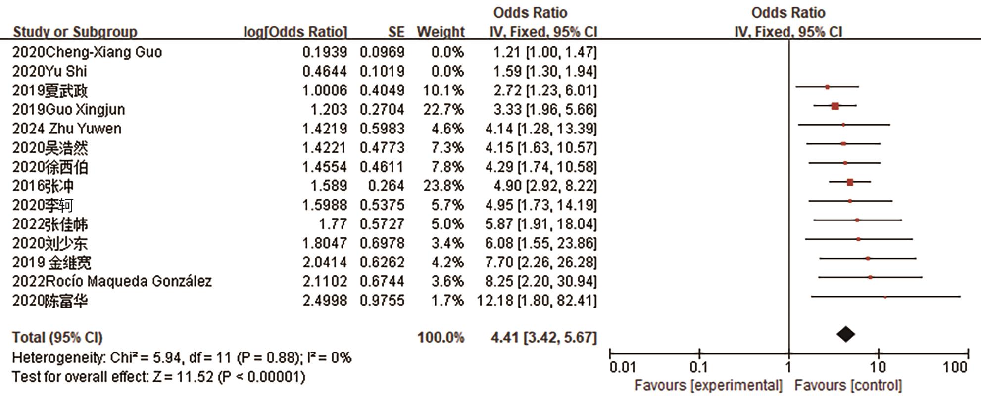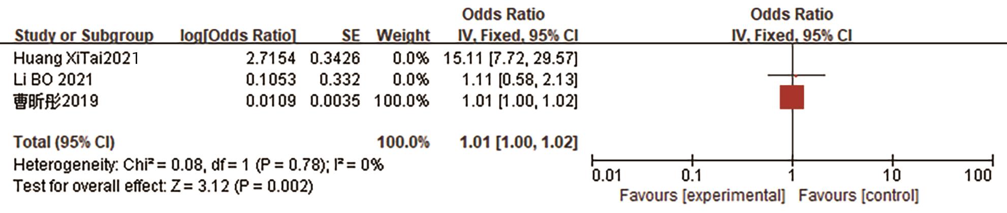 预测因子 纳入文献(篇) 异质性检验 效应模型 合并效应量 I2 值(%) P值 OR(95%CI) Z值 P值 BMI 11[12,17-18,21-22,26,28,35,38,42-43] 93 <0.000 01 随机效应 1.46(1.27~1.68) 5.26 <0.000 01 术后第1天引流淀粉酶 3[10,28-29] 97 <0.000 01 随机效应 1.42(1.10~1.83) 2.67 0.008 术前血清白蛋白≥35 g/L 3[10,30,35] 37 0.21 固定效应 0.89(0.83~0.96) 3.2 0.001 术前血清白蛋白<35 g/L 4[15,19,23,38] 0 0.67 固定效应 4.34 (2.48~7.57) 5.16 <0.000 01 胰管直径<3 mm 14[4,11,14-16,19,21-22,27,31-33,38-39] 82 <0.000 01 随机效应 3.61(2.46~5.30) 6.56 <0.000 01 胰管直径≥3 mm 12[5,13,18,23,25-26,28,30,35,41-43] 83 <0.000 01 随机效应 0.50(0.40~0.63) 6.11 <0.000 01 胰腺质地软 11[4,11,14-16,19,22,24,27,37,40] 44 0.05 随机效应 5.06(3.57~7.17) 9.12 <0.000 01 胰腺质地硬 7[13,18,23,26,30,41-42] 0 0.80 固定效应 0.18(0.15~0.21) 17.58 <0.000 01 脂肪评分 4[14,31-33] 50 0.11 随机效应 2.07(1.22~13.53) 12.69 0.007 肿瘤位置 8[5,13,20,22,24,34-36] 0 0.53 固定效应 2.25(1.79~2.81) 7.06 <0.000 01 失血量 4[11,15,30,38] 11 0.34 固定效应 5.49(3.15~9.59) 5.99 <0.000 01 性别 5[4-5,34-35,41] 50 0.09 随机效应 2.01(1.41~2.88) 3.82 0.000 1 手术时间 2[13-14] 0 0.45 固定效应 1.06(1.02~1.11) 2.65 0.008 主胰管指数 2[20,37] 0 >0.1 固定效应 0.00(0.00~0.01) 5.15 <0.000 01 胰腺CT值 2[20,36] 0 0.9 固定效应 0.94(0.90~0.98) 3.05 0.002 -