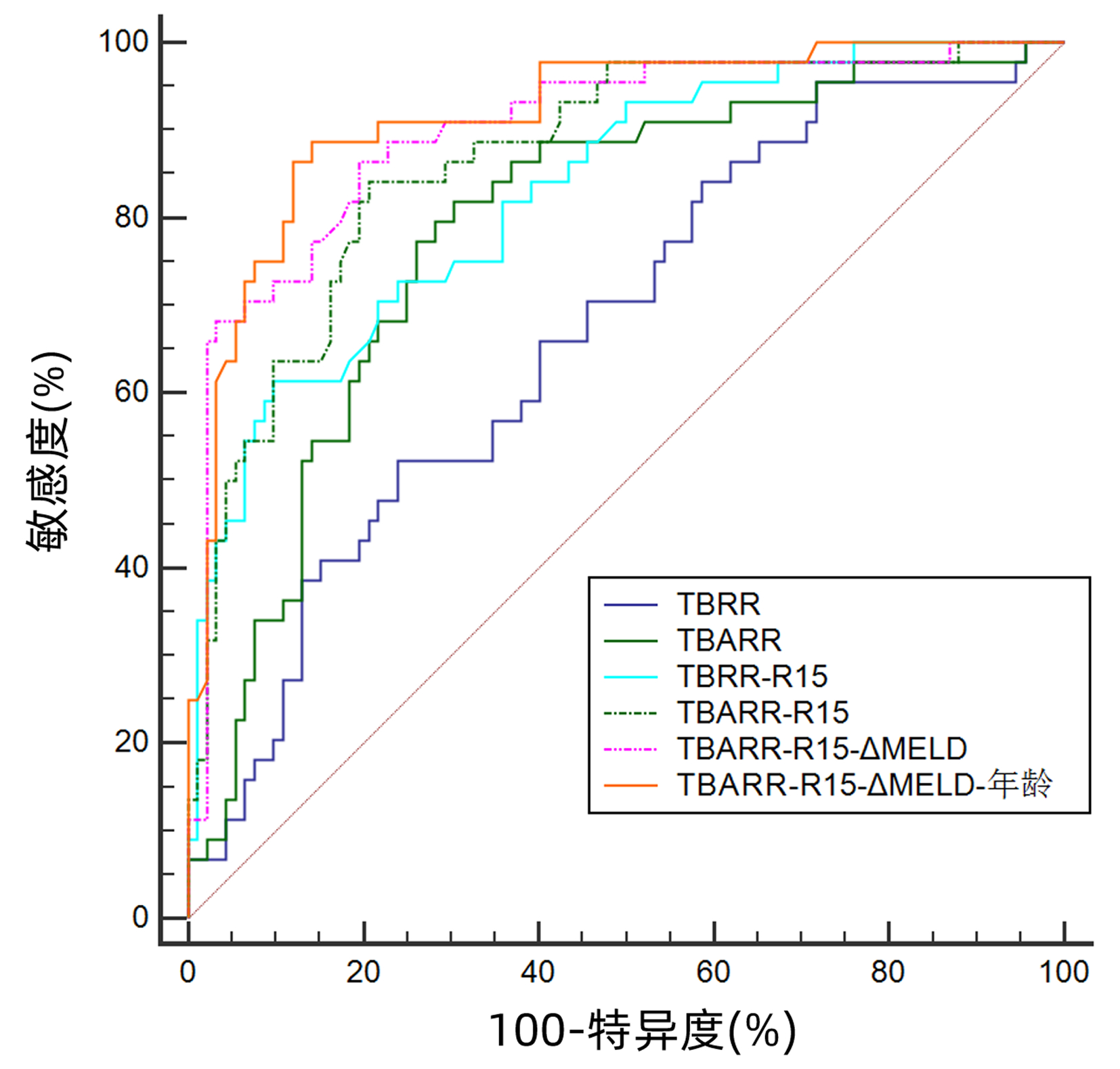 Objective To establish a new model of indocyanine green (ICG) clearance test combined with total bilirubin actual resident rate (TBARR) for predicting the short-term prognosis of patients with hepatitis B virus-related acute-on-chronic liver failure (HBV-ACLF) treated with artificial liver support system (ALSS) therapy. Methods A retrospective analysis was performed for the clinical data of 136 patients with HBV-ACLF who underwent ALSS therapy in Department of Infectious Diseases, The Affiliated Hospital of Southwest Medical University, from June 2017 to July 2021, and according to the prognosis at 3-month follow-up, they were divided into survival group with 92 patients and death group with 44 patients. Related indicators were measured at the time of the confirmed diagnosis of ACLF, including biochemical parameters, coagulation, indocyanine green retention rate at 15 minutes (ICGR15), and effective hepatic blood flow (EHBF), and related indices were calculated, including Model for End-Stage Liver Disease (MELD) score, MELD difference (ΔMELD), Child-Turcotte-Pugh (CTP) score, total bilirubin clearance rate (TBCR), total bilirubin rebound rate (TBRR), and TBARR. The Mann-Whitney U test was used for comparison of continuous data with skewed distribution between two groups; the chi-square test was used for comparison of categorical data between groups. A binary logistic regression analysis was used to establish a combined predictive model for the prognosis of HBV-ACLF after ALSS therapy. The area under the ROC curve (AUC) was used to compare the accuracy of various models in judging the short-term prognosis of patients with HBV-ACLF after ALSS therapy, and the Z test was used for comparison of AUC. Results There were significant differences between the death group and the survival group in MELD score, ΔMELD, CTP score, ICGR15, EHBF, TBRR, TBARR, neutrophil count, percentage of neutrophils, lymphocyte count, platelet count, alkaline phosphatase, gamma-glutamyl transpeptidase, total bilirubin, albumin, prothrombin time, international normalized ratio, prothrombin time activity, prealbumin, fibrinogen, serum sodium, age, and the incidence rate of hepatic encephalopathy (all P < 0.05). The multivariate logistic regression analysis showed that age (odds ratio [OR]=1.096, 95% confidence interval [CI]: 1.056-1.137, P < 0.001), neutrophil count (OR=1.214, 95%CI: 1.044-1.411, P=0.012), TBRR (OR=0.989, 95%CI: 0.982-0.996, P=0.001), TBARR (OR=1.073, 95%CI: 1.049-1.098, P < 0.001), ΔMELD (OR=1.480, 95%CI: 1.288-1.701, P < 0.001), CTP score (OR=2.081, 95%CI: 1.585-2.732, P < 0.001), and ICGR15(OR=1.116, 95%CI: 1.067-1.168, P < 0.001) were independent influencing factors for short-term mortality in patients with HBV-ACLF after ALSS therapy. The binary logistic regression analysis was used to establish four combined predictive models for predicting the prognosis of HBV-ACLF after ALSS therapy, i.e., TBRR-ICGR15, TBARR-ICGR15, TBARR-ICGR15-ΔMELD, and TBARR-ICGR15-ΔMELD-age, with an AUC of 0.830, 0.867, 0.900, and 0.917, respectively, and the combined predictive models had a larger AUC than each index alone (age, neutrophil count, TBRR, TBARR, ΔMELD, MELD score, CTP score, and ICGR15), among which the TBARR-ICGR15-ΔMELD-age model had the largest AUC. The combined models TBARR-ICGR15-ΔMELD and TBARR-ICGR15-ΔMELD-age had sensitivities and specificities of > 80%. Conclusion The combined predictive model established by ICGR15 and TBARR has a good value for in predicting the short-term prognosis of patients with HBV-ACLF after ALSS therapy, and the combined predictive model has a better accuracy than the single model in judging prognosis.