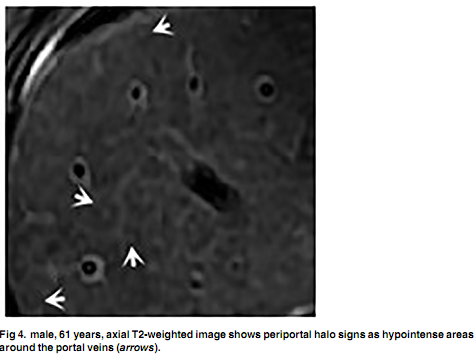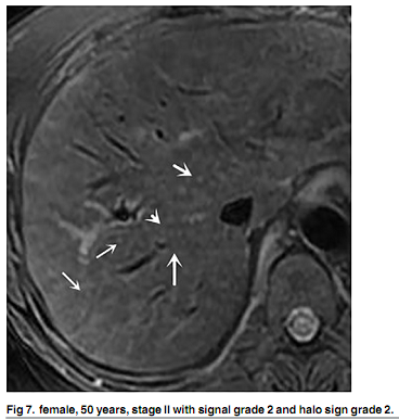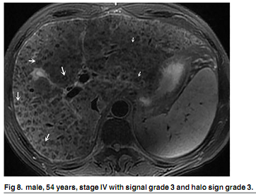 MRI显示,25例患者呈门静脉周围高信号,8例呈I期和II期均匀肝脏信号强度,以及25例呈非均质肝脏信号变化。组织学分级和肝脏信号强度不一致之间存在正相关(P <0.001)。