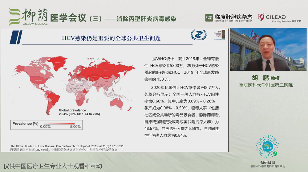 陈红松教授主持开场报告,饶慧瑛教授介绍了我国HCV感染的现状及清除进程。据统计,目前HCV感染的全球流行率为0.7%。近年来,为实现世界卫生组织提出的消除病毒性肝炎威胁的战略目标,我国逐步推行相关政策,积极推进丙型肝炎防治进程。依照我国的丙型肝炎消除防治经验及国家相继出台的政策文件,对住院患者丙型肝炎抗体进行筛查,并对阳性患者进行院内管理,可有效加速消除丙型肝炎。根据国内外不同的丙型肝炎防治办法,可以通过对较小或特定感染人群实现微消除,建立社会多部门联合防治,实现覆盖丙型肝炎诊治全流程,快速有效筛查出HCV感染者,提升传染源的管理和治疗率。